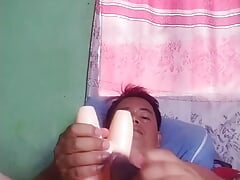 Uncircumcised boy shag a silicone vag and arse