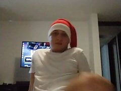 Guy in Christmas costume strips and masturbates his smooth uncut dick for a festive wank