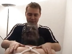 Sweaty and intense gay BDSM bondage fetish session with breath control and leather