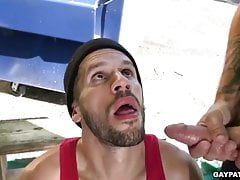 Stepdad goes rough on his adorable stepson, filling his mouth with cum on the stairs