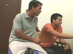Cute gay twink gives his future boss a hot blowjob on his first day and gets pounded without a condom
