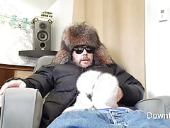 A Guy In A Winter Hat With Earflaps And A Blue Jacket, Masturbates His Penis And Cums With Hot Sperm