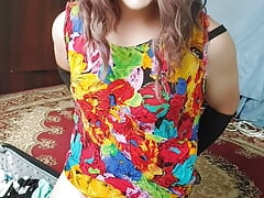 Cute and sweet sissy crossdresser femboy Sweet Lollipop tying out a pink pantyhose and pantie.