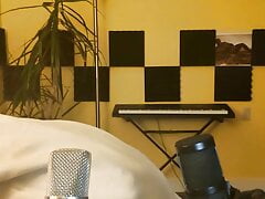 Moaning out of pleasure when jerking my fat curved cock again, messing up my green t-shirt by shooting creamy cumshots