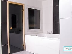 Twinks share bathroom for naked threesome sex and blowjob
