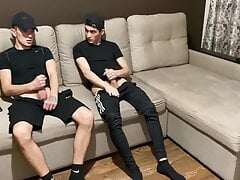 Straight jerk off with twink gay friend in sportswear (blowjob and cum in mouth)